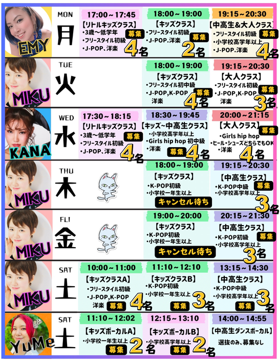 すでに定員になり募集を締め切らせて頂いてるクラスもありますが、